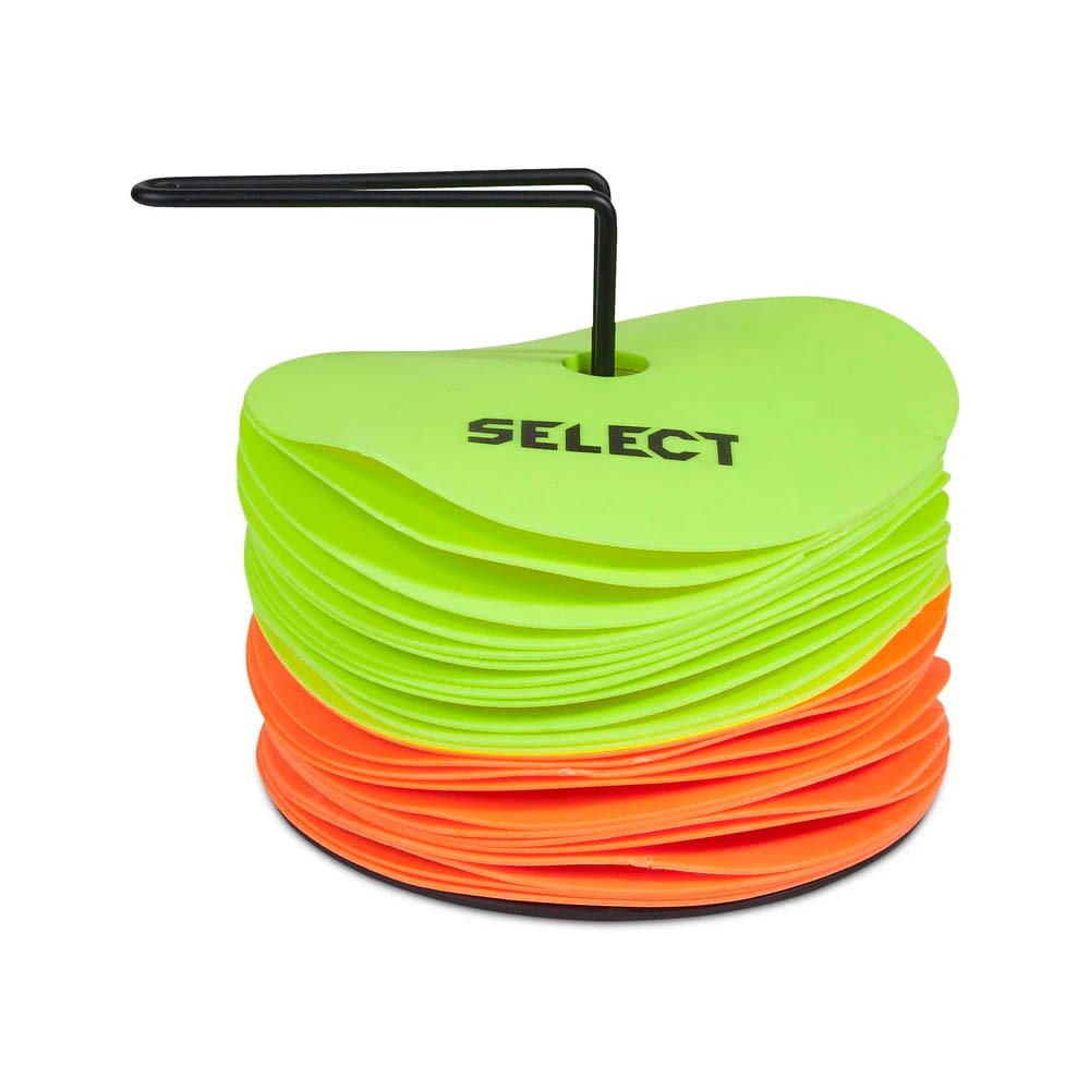 Select markeringssett med 12 gule og 12 oransje markeringsmatter på metallholder. Mattene brukes istedenfor kjegler til blant annet håndballtrening. Markeringsmattene er produsert i et sklisikkert gummimateriale, og er derfor spesielt velegnet til bruk innendørs og i hall.