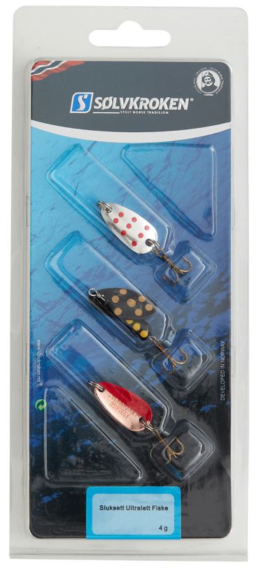 Sølvkroken sluksett til ultralett ferskvannsfiske. I dette settet får du to Spesial Classic-sluker. Dette er en knallgod allroundsluk til fiske etter både ørret, abbor og røye. Her får du de to mest populære fargene av Spesial Classic. I tillegg følger det med en svart Spesial Spinner, denne bør også prøves på kvelds- og nattestid. Alle tre veier 4 gram.